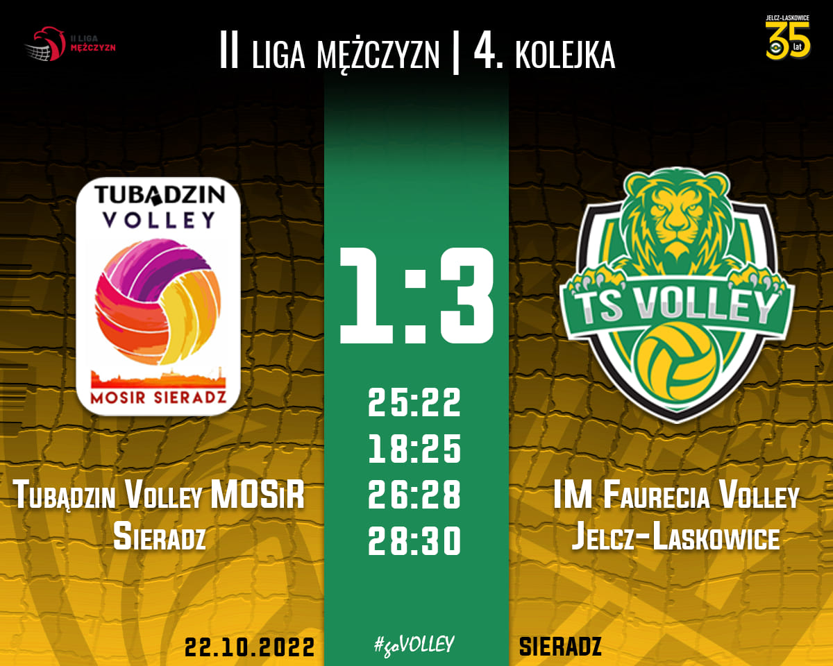 Spotkanie IV kolejki z Tubądzin Volley MOSiR Sieradz było starciem lidera z wiceliderem rozgrywek. Mecz rozgrywaliśmy na wyjeździe, a do ekipy z Sieradza przed spotkaniem traciliśmy tylko punkt. Stawką pojedynku była więc pozycja lidera rozgrywek II Ligi Siatkówki Mężczyn. Do meczu Jelczańskie Lwy przystąpiły bez atakująćego Adriana Zająca. Początek meczu należał do podopiecznych Krzysztofa Janczaka i Krzysztofa Pilawy. Nasi siatkarze szybko objęli kilkupunktowe, lecz gopodarze nie składali broni i sukcesywnie odrabiali straty. W połowie seta to zawodnicy Tubądzin Volley odskoczyli na kilka punktów (16:14; 21:19). Prowadzenie siatkarze z Sieradza utrzymali do końca premierowej odsłony, którą wygrali 25:22. Drugi set od niemal samego początku układał się po myśli zawodników IM Faurecia Volley. Nasz zespół niemal nie popełniał błędów i narzucał trudne warunki gry gospodarzom agresywną zagrywką. Zawodnicy naszego klubu prowadzili 8:16, później 16:12, a pod koniec seta powiększyli prowadzenie do nawet 7 punktów (21:14). Utrzymali je na takim poziomie do końca partii, która zakończyła się wynikiem 18:25. Kolejne 2 sety były prawdziwym siatkarskim dreszczowcem. Walka była bardzo wyrównana. W połowie seta przegrywaliśmy 16:13, aby po kmilku akcjach i skutecznych atakach wyjść na porowadzenie 21:20. Końcowy fragment 3 partii to twarda walka punkt za punkt i zwycieśtwo Jelczańskich Lwów 28:26. Czwarty set miał jeszcze bardziej dramatyczny przebieg i więcej zwrotów akcji. Gra toczyła się punkt za punkt do stanu 18:18. Wtedy siatkarze IM faurecia Volley przy zagrywce Dawida Gruszczyńskiego odskoczyli na 22:18. Wtedy serią punktową odpowiedzieli gospodarze i kilka chwil później zespół z Sieradza miał piłkę setową (24:23). Kibice zgormadzeni na trybunach zobaczyli następnie kilka długich wymian, które dostarczyły wielkich emocji. Nasi zawodnicy nie wykorzystali piłki meczowej przy stanie 27:26. Przy stanie w polu zagrywki pojawił się znów "Grucha", który najpierw mocnym serwisem utrudnił życie rywalom, a przy stanie 29:28 zaserwował asa!. W taki sposób wygraliśmy w meczu na szczycie grupy 3 rozgrywek II Ligi i nadal jesteśmy niepokonani w sezonie 2022/2023. Na uwagę zasługują 21 punktów zdobytych przez przyjmujacego Maćka Lewickiego oraz aż 7 punktowych bloków Jędrzeja Maćkowiaka.